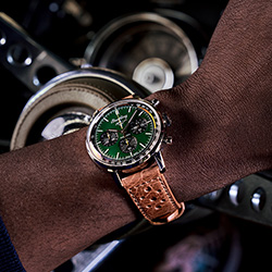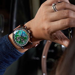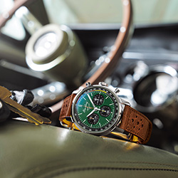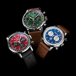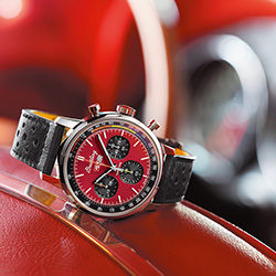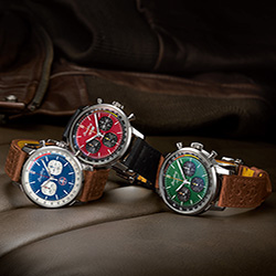 Эти смелые хронографы с заводным характером отличаются ярким цветом циферблата с оранжевыми и желтыми или красными и синими акцентами. Часы дополняет ремешок из телячьей кожи в гоночном стиле. На задней крышке корпуса из нержавеющей стали выгравирован впечатляющий логотип автомобиля. Кнопки хронографа дополняют циферблат. Все три модели часов обладают водонепроницаемостью до 10 бар (100 м).
