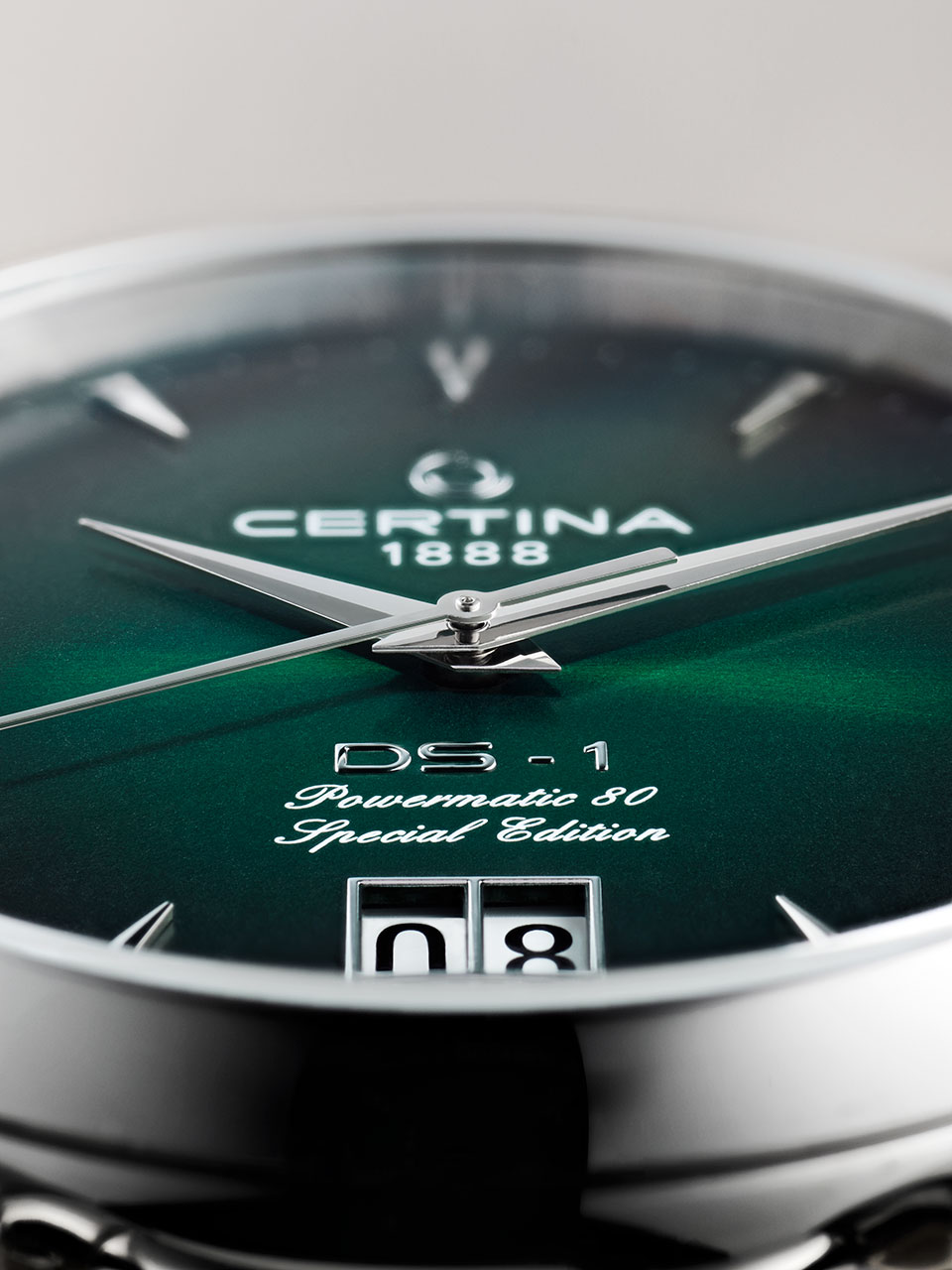 DS-1 Big Date 60th Anniversary – современная интерпретация своего знаменитого предшественника. Выпуклый циферблат имеет фирменный зеленый оттенок Certina. Градация цвета и гильоше «Солнечные лучи» подчеркивают его глубину и насыщенность. Большое окошко даты на отметке «6 часов», клиновидные часовые отметки с обработанными краями и удлиненные стрелки обеспечивают оптимальную считываемость. Задняя крышка корпуса диаметром 41 мм дополнена памятным оттиском в честь 60-летнего юбилея. Браслет с миланским плетением из нержавеющей стали завершает элегантный образ. Часы представлены в специальной упаковке.
