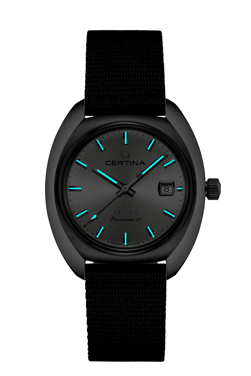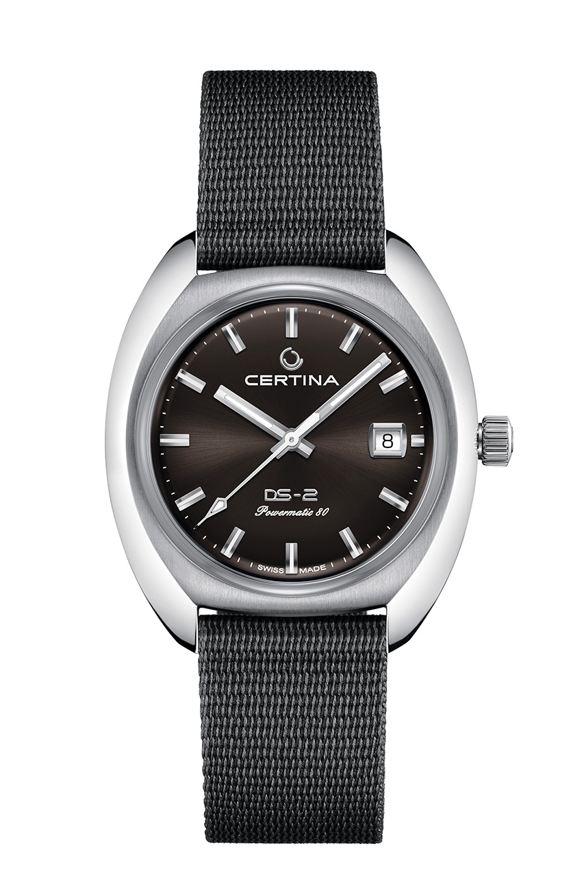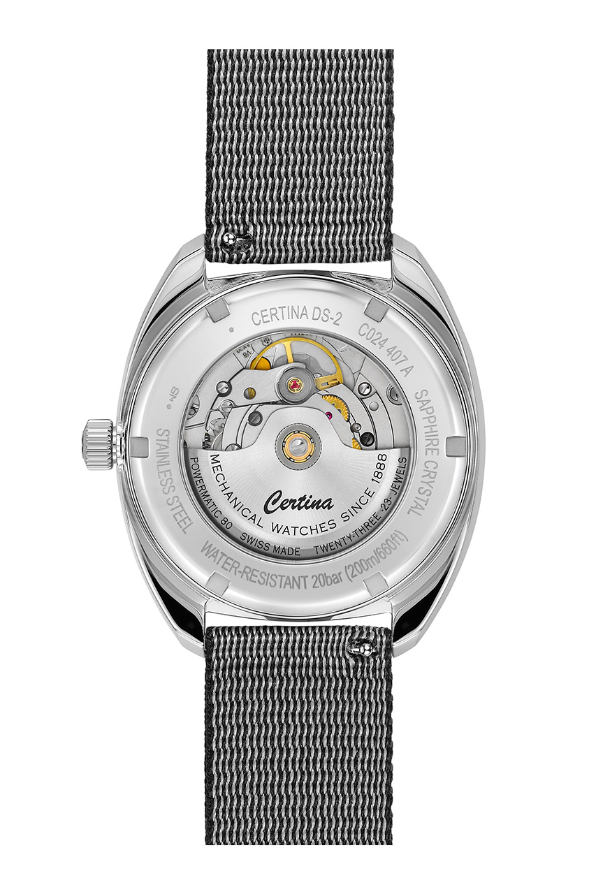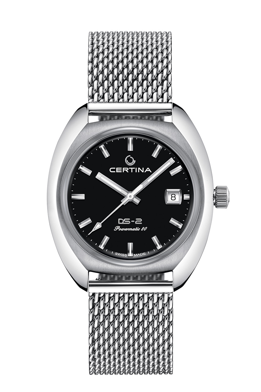 Первая модель DS-2 1968 года выпуска знаменовала новый этап для марки Certina с точки зрения создания прочных часовых механизмов. Она стала естественным и стильным продолжением истории успеха, начавшейся за девять лет до этого с выпуска модели DS-1. Как историческая модель DS-2, так и ее современное исполнение отличаются бочкообразной формой корпуса, формой «обрезанного с двух сторон эллипса», как гласила реклама 1968-го года. Сглаженные углы и грани сочетаются с круглым циферблатом, защищенным сапфировым стеклом. Новые часы DS-2 доступны в четырех вариантах исполнения – в матовом черном или серебристом оттенках, с синим или черным сатинированным циферблатом. Прямоугольные стрелки и индексы с покрытием Super-LumiNova® подчеркивают винтажный характер модели. Стальной корпус шириной 40 мм и длиной 38 мм дополнен браслетом с миланским плетением или ремешком NATO из материала #tide ocean material®, в основе которого – океанический пластик.
