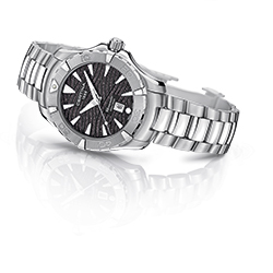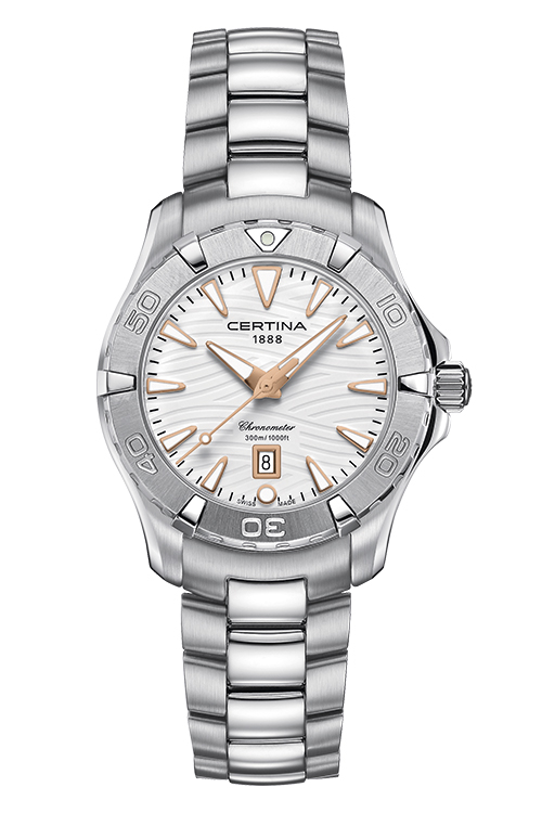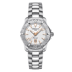 Модель DS Action Lady чувствует себя уверенно в окружении морской стихии. Завинчивающиеся заводная головка и задняя крышка обеспечивают ее изящному корпусу 34 мм из нержавеющей стали водонепроницаемость до 20 бар. Циферблат с серебряным напылением и тонкой отделкой (гильоше «солнечные лучи») украшен тремя бриллиантами на отметке «12 часов». Драгоценные камни придают легкий оттенок роскоши этой повседневной модели. Часы дополняет браслет из нержавеющей стали с чередованием матовых и полированных поверхностей. DS Action Lady имеет официальный сертификат хронометра. Точность хода кварцевого часового механизма Precidrive™ женской модели от Certina официально подтверждена сертификатом знаменитого Швейцарского Института тестирования хронометров (COSC).