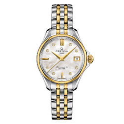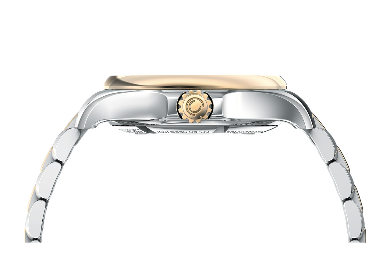 - C032.207.22.116.00 Перламутровый циферблат, нержавеющая сталь и элементы с PVD-покрытием цвета желтого золота.