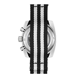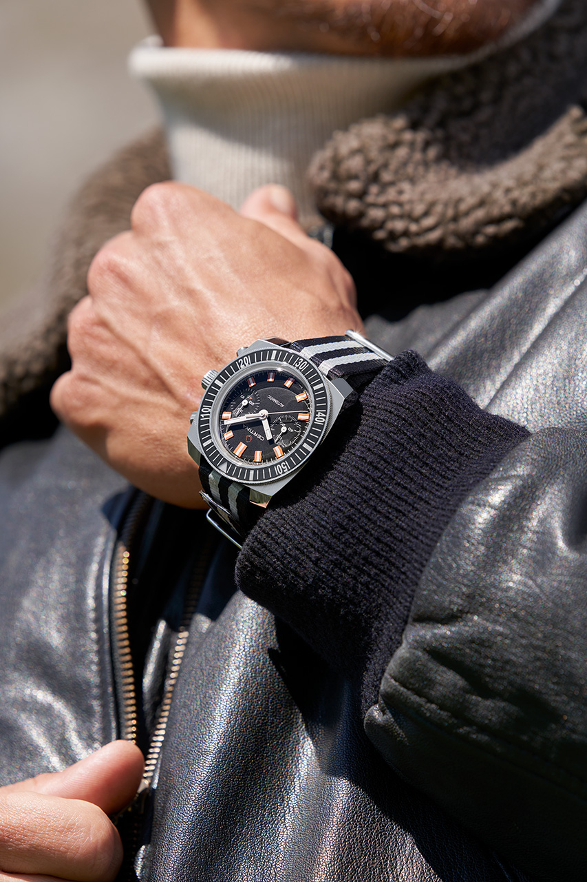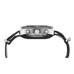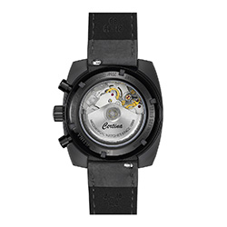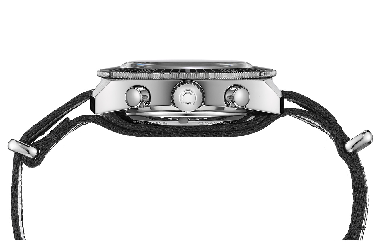 Элегантный винтажный стиль – лишь одна из многих граней нового хронографа DS Chronograph Automatic 1968. Другой аспект – его спортивный характер, подчеркнутый 30-минутным счетчиком на отметке «3 часа» и дополненный центральной секундной стрелкой и малой секундной стрелкой на отметке «9 часов». Эффектная завинчивающаяся заводная головка и водонепроницаемость до 20 бар (200 м) являются залогом повышенной надежности. Матовый черный кожаный ремешок с белой строчкой, который легко поменять благодаря системе быстрой замены Certina, обеспечивает дополнительную безопасность и комфорт. Наряду с черной версией также доступна версия из нержавеющей стали с оранжевыми акцентами на циферблате и NATO-ремешком в черно-белую полоску, изготовленным из переработанного материала #tide ocean®.