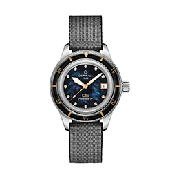Модель DS PH200M – одна из самых популярных в коллекции Certina. Последняя из выпущенных версий доказала, что этот классический винтажный дизайн удачно выглядит и в уменьшенном формате. Дебютная модель новой коллекции сочетает изысканный перламутр, черную керамику и сияющие бриллианты со стильным ремешком, выполненным из переработанного материала #tide ocean material®. Модель оснащена автоматическим калибром с пружиной баланса NivachronTM, обладающей антимагнитными свойствами и обеспечивающей максимальную надежность механизма.