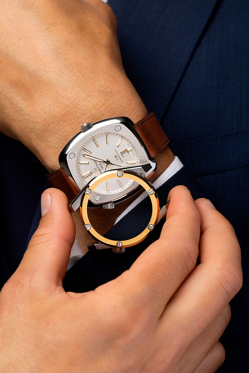 Комплект Sport&Urban впечатляет элегантным сочетанием двух цветов. Серебряный циферблат с золотыми индексами и гильоше «солнечные лучи» идеально сочетается с корпусом в урбанистическом стиле и его спортивной версией с золотым PVD-покрытием, а также темно-коричневым кожаным ремешком и браслетом миланского плетения из нержавеющей стали.