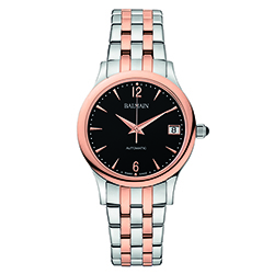 | 9. Classic R Lady Automatic B3998.33.64: стальной корпус с PVD-покрытием розовым золотом, стальной браслет с PVD-покрытием розовым золотом чётных звеньев; чёрный циферблат, украшенный гильоше в стиле «солнечные лучи» (Rayonne) с арабскими цифрами 6, 12 и девятью условными индексами с PVD-покрытием розовым золотом. | |