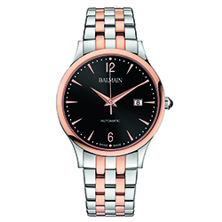 | 6. Classic R Automatic B.3988.33.64: стальной корпус с PVD-покрытием розовым золотом, стальной браслет с PVD-покрытием розовым золотом чётных звеньев; чёрный циферблат, украшенный гильоше в стиле «солнечные лучи» (Rayonne) с арабскими цифрами 6, 12 и десятью условными индексами с PVD-покрытием розовым золотом. |