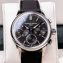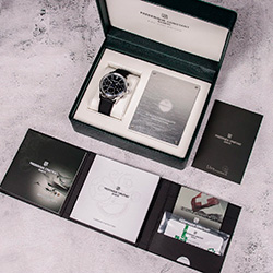 Frederique Constant Flyback Chronograph DailyWatch II поставляется с сертификатом испытаний, чтобы подчеркнуть и доказать точность механизма, в роскошной коробке с табличкой DailyWatch. Чистый и точный хронограф – это то, что мы хотели, и это то, что мы можем предложить вам!