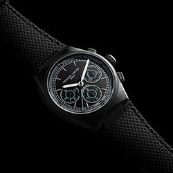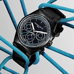 Результат — полностью монохромные часы с матовым чёрным циферблатом без декоративных узоров. Минимализм усиливает читаемость, а контрастные бирюзовые акценты выделяют стрелки и счётчики хронографа. Малая секундная стрелка расположена на «9 часах», а регистры хронографа — на «3» и «6» часах, создавая чёткую и динамичную композицию.