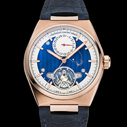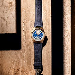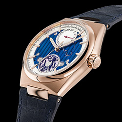 Открытый циферблат демонстрирует элегантное и насыщенное голубое украшение Côtes de Genève, подчеркивающее 30-й внутренний механизм бренда, которым также можно любоваться через заднюю крышку из хрусталя. В соответствии с лучшими традициями часового дела это замечательное творение имеет фаски на мостиках, которые отполированы вручную. Этой степенью отделки до сих пор могут похвастаться лишь немногие часовые производства.