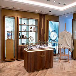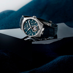 Синий циферблат украшен узором в виде глобуса, символизирующим уникальный стиль коллекции Highlife. Вечный календарь показывает день, дату, месяц и високосный год, а турбийон на отметке 6 часов подчеркивает сложность и точность механизма.