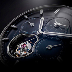 - Циферблат: Синий с узором глобуса, светящиеся стрелки и индексы серебристого цвета, дата на отметке 3 часа, турбийон на отметке 6 часов, день недели на отметке 9 часов, месяц и високосный год на отметке 12 часов
