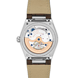 Многогранный современный корпус играет с мерцающими бликами драгоценного металла. Производитель подчеркнул этот эффект, совместив сатинированный корпус с полированными безелем и заводной головкой.