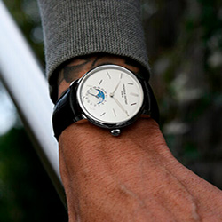 Frederique Constant — швейцарское производство, которое с гордостью создает свои механизмы и собирает часы вручную. В новой часовой коллаборации Romaric André добавил к традиционной модели Moonphase некую "человеческую ошибку", выраженную через неправильное расположение меток и небрежно написанных вручную логотипа и указателя даты. Такие необычные элементы циферблата подчеркивает ремесленную составляющую этих часов.