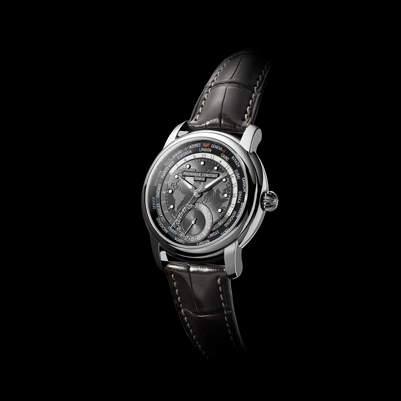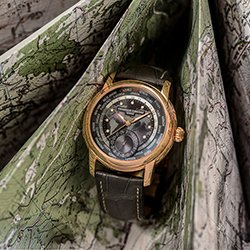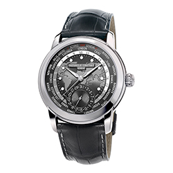 На часах выделяются два отдельных диска: первый – с 24-часовым индикатором день-ночь, второй – с названиями 24 городов. Поскольку калибр FC-718 является механизмом собственной разработки бренда, он украшен отделкой перлаж (зернение) и круговым узором Côtes de Genève. Имеет запас хода 42 часа. Темно-серый хронометр комплектуется темно-серым ремешком из крокодиловой кожи с белыми стежками.