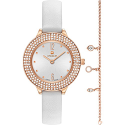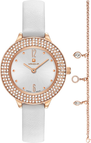 | 1. Hanowa Alessia 16-8008.09.001SET: стальной корпус с розово-золотым PVD-покрытием и россыпью ювелирных камней. Серебристый циферблат с розово-золотыми стрелками, арабскими цифрами и условными часовыми индексами. Белый кожаный ремешок. Отдельный браслет-цепочка из нержавеющей стали с PVD-покрытием из розового золота с декором в виде подвесок. | |
