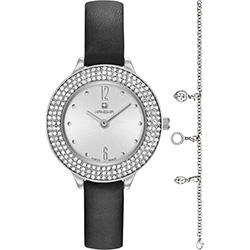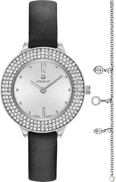 | 2. Hanowa Alessia 16-8008.04.001SET: стальной корпус с полированной серебристой отделкой и россыпью ювелирных камней. Серебристый циферблат с серебристыми стрелками, арабскими цифрами и условными часовыми индексами. Чёрный кожаный ремешок. Отдельный браслет-цепочка из нержавеющей стали с полированной отделкой и декором в виде подвесок. |