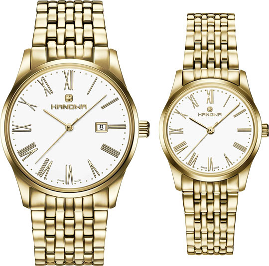 | 1. Hanowa Carlo & Carla 16-8066.02.001 SET: стальные корпуса с жёлто-золотым PVD-покрытием; белые циферблаты с жёлто-золотыми центральными стрелками и арабскими цифрами; стальные браслеты с PVD-покрытием из жёлтого золота. | |