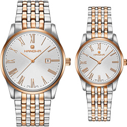 | 2. Hanowa Carlo & Carla 16-8066.12.001 SET: стальные корпуса с частичным розово-золотым PVD-покрытием; серебристые циферблаты с розово-золотыми центральными стрелками и арабскими цифрами; стальные браслеты с розово-золотым PVD-покрытием звеньев чётных рядов. | |