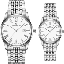 | 4. Hanowa Carlo & Carla 16-8066.04.001 SET: стальные корпуса и стальные браслеты; белые циферблаты с серебристыми центральными стрелками и арабскими цифрами. |