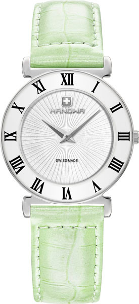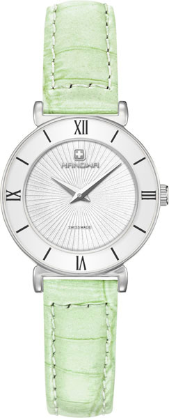 | 1. Hanowa Splash 16-4053.04.001.08: стальной корпус; серо-голубой циферблат и серо-голубой безель с полным набором чёрных римских цифр, серебристые стрелки; кожаный ремешок фисташкового (пастельно-зелёного) цвета. | |