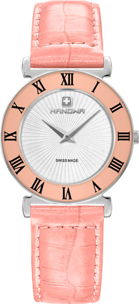 На серебристом циферблате с отделкой «Sunray» («Солнечные лучи») и логотипом марки «Hanowa» установлены центральные стрелки часов и минут, накладные арабские цифры (6,12) и каплевидные условные часовые индексы. Стрелки, цифры и индексы могут иметь розово-золотой или серебристый цвет.
