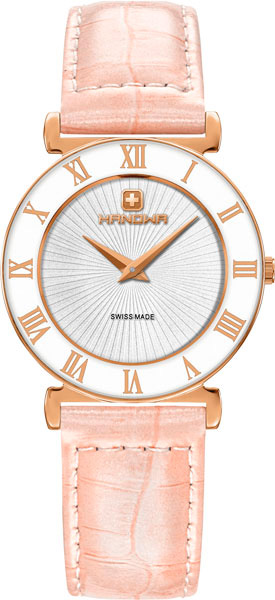 | 3. Hanowa Splash 16-4053.09.001.09: стальной корпус с PVD-покрытием из розового золота; серо-голубой циферблат, белый безель с полным набором розово-золотых римских цифр, стрелки с розово-золотым PVD-покрытием; кожаный ремешок светло-кораллового (светло-розового) цвета. | |