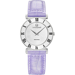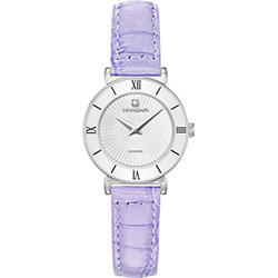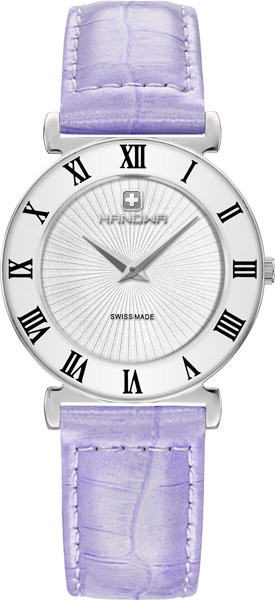 | 4. Hanowa Splash 16-6053.04.001.13: стальной корпус; серо-голубой циферблат и серо-голубой безель с чёрными римскими цифрами и условными индексами, серебристые стрелки; кожаный ремешок аметистового цвета. |