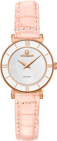 | 3. Hanowa Splash 16-6053.09.001.09: стальной корпус с PVD-покрытием из розового золота; серо-голубой циферблат, белый безель с розово-золотыми римскими цифрами и условными индексами, стрелки с розово-золотым PVD-покрытием; кожаный ремешок светло-кораллового (светло-розового) цвета. | |