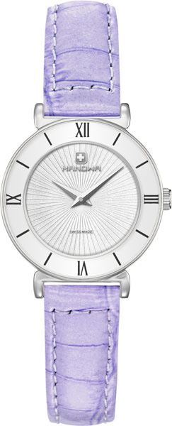 | 4. Hanowa Splash 16-4053.04.001.13: стальной корпус; серо-голубой циферблат и серо-голубой безель с полным набором чёрных римских цифр, серебристые стрелки; кожаный ремешок аметистового цвета. |