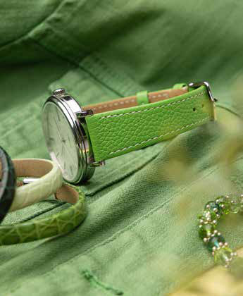 Ремешок изготовлен из глубоко окрашенной в бочке структурированной итальянской телячьей кожи. Этот материал известен своей мягкостью и долговечностью, благодаря чему ремешок сохраняет свой внешний вид и комфорт на протяжении долгого времени.