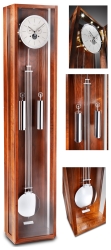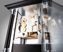Часы оснащены механизмом (на 12 рубинах и 8 подшипниках) с тросовым приводом, двумя никелированными гирями и большим серебристым круглым маятником на специальной длинной подвеске. Запас хода механизма – восемь дней. Через каждые полчаса скрытый гонг часов воспроизводит бой.