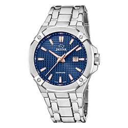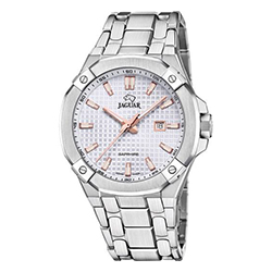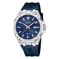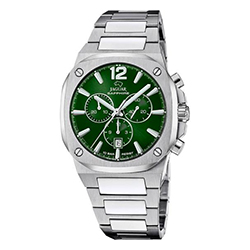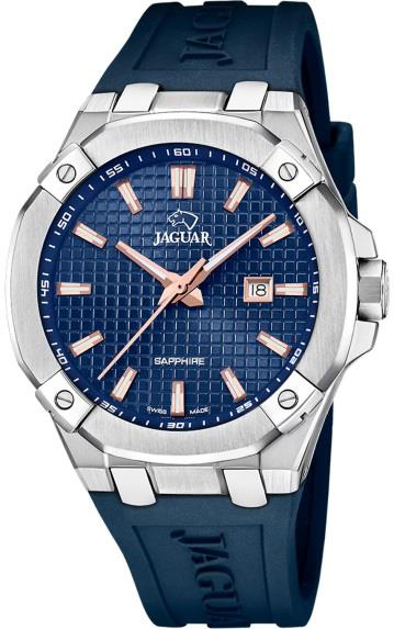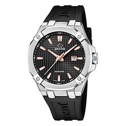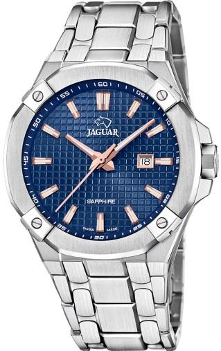 Jaguar Diplomatic (J1010, J1009) – стильная классика с налетом спортивного дизайна. Восемь скруглённых углов корпуса, геометрический узор на циферблате, вставки цвета розового золота и выразительные стрелки стиля Dauphine – всё это придает часам выразительность и статус. Эти модели доступны как на стальном браслете, так и на каучуковом ремешке.