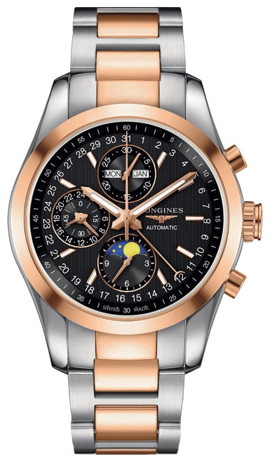 | 4. Longines Conquest Classic Moonphase L2.798.5.52.7: стальной корпус и стальной браслет, безель, заводная головка, пушеры и звеньями центрального ряда браслета – 18-каратное розовое золото, чёрный циферблат. | |