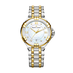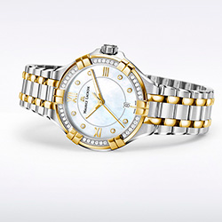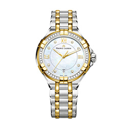 1. Maurice Lacroix Aikon Ladies AI1006-DY503-171-1 Корпус из нержавеющей стали с полированной отделкой поверхности, безеля и декоративных звеньев. Внешняя кромка безеля и декоративные звенья – с жёлто-золотым PVD-покрытием. Безель инкрустирован тридцатью шестью бриллиантами огранки TW, диаметром 1,2 мм и общим весом 0,25 карата. Перламутровый, с голубым оттенком, циферблат: центральные стрелки с PVD-покрытием жёлтым золотом и люминесцирующими вставками на стрелках часов и минут; восемь бриллиантов огранки TW, диаметром 1,2 мм и общим весом 0,05 карата в роли условных индексов, римские цифры с жёлто-золотым PVD-покрытием, окошко даты. Браслет из нержавеющей стали с пятью рядами звеньев из нержавеющей стали с сатинированной и полированной отделкой, чётными рядами звеньев с жёлто-золотым PVD-покрытием, с двойной раскладывающейся застёжкой из нержавеющей стали на двух кнопках с сатинированной и полированной отделкой и круговым зернением. |
