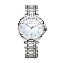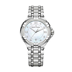 4. Maurice Lacroix Aikon Ladies AI1006-SD502-170-1 Корпус из нержавеющей стали с полированной отделкой поверхности, безеля и декоративных звеньев. Безель инкрустирован тридцатью шестью бриллиантами огранки TW, диаметром 1,2 мм и общим весом 0,25 карата. Перламутровый, с голубым оттенком, циферблат: центральные стрелки с алмазной обработкой, родиевым покрытием и люминесцирующими вставками на стрелках часов и минут; восемь бриллиантов огранки TW, диаметром 1,2 мм и общим весом 0,05 карата в роли условных индексов, римские цифры с родиевым покрытием, окошко даты. Браслет из нержавеющей стали с пятью рядами звеньев из нержавеющей стали с сатинированной и полированной отделкой, с двойной раскладывающейся застёжкой из нержавеющей стали на двух кнопках с сатинированной и полированной отделкой и круговым зернением. |