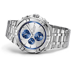 4. Maurice Lacroix Aikon Chronograph AI1018-SS002-131-1 Корпус из нержавеющей стали с сатинированной отделкой поверхности и полированной отделкой декоративных звеньев. Серебристо-синий сатинированный циферблат: центральные стрелки с алмазной обработкой, родиевым покрытием и люминесцирующими вставками на стрелках часов и минут; условные индексы с родиевым покрытием, малая секундная стрелка, 30-минутный счётчик, счётчик 1/10 секунды, окошко даты. 5-рядный браслет из нержавеющей стали с сатинированной отделкой, с двойной раскладывающейся застёжкой из нержавеющей стали на двух кнопках с сатинированной и полированной отделкой и круговым зернением. |
