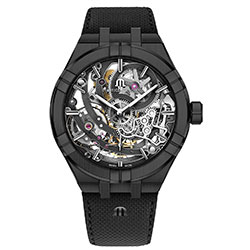Следуя современным тенденциям в своем творческом поиске, мастера Maurice Lacroix разработали скелетонизированные часы с покрытием антрацитового оттенка. Модель заключена в стальной корпус диаметром 45 мм с черным PVD-покрытием и сатинированной отделкой. Все грани корпуса идеально отполированы – как и шесть двойных выступов ранта, ставшие визитной карточкой коллекции AIKON.