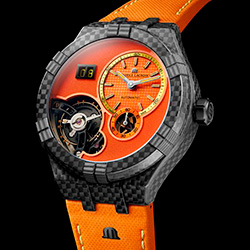 Рифленый, смещенный от центра циферблат часов и минут с оранжевым сатинированием заключен в желтый круг. Эти цвета были выбраны Maurice Lacroix, чтобы соответствовать оттенкам Pantone, вдохновленным темой Only Watch 2021. Часовые стрелки и индексы выполнены в черном цвете и заполнены желтым люминесцентным составом Super-LumiNova, ниже расположена скелетонизированная малая секундная стрелка. Основная часть циферблата является обратной стороной платины, дополненной вертикальным сатинированием и оранжевым PVD-покрытием.