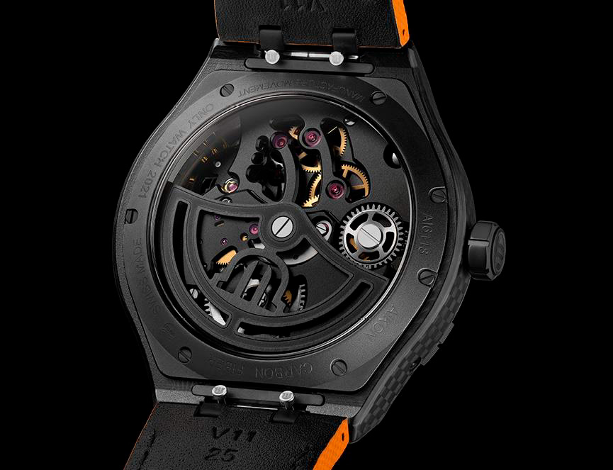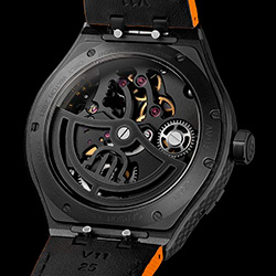 Привлекательность этой модели подчеркнута скелетонизированным циферблатом, через который обладатель часов может в движении наблюдать баланс, спираль, анкерную вилку и спусковое колесо. Эти характеристики отсылают к миру автоспорта, в котором именно успешное взаимодействие элементов позволяет достичь безупречного результата. Через изогнутый мост баланса с DLC-покрытием видны расположенные под ним элементы механизма.