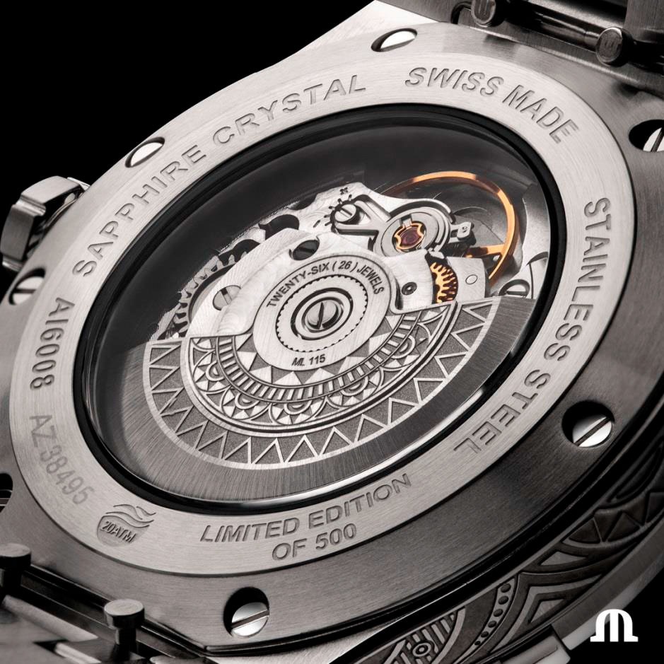 Через заднюю крышку из сапфирового стекла просматривается автоматический калибр ML115. Механизм украшен круговым зернением, спиралевидным узором, а также мотивом Côtes de Genève. На роторе, заводной головке и браслете выгравированы идентичные узоры.