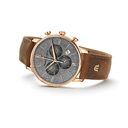 Модель Eliros Chronograph также украшена сатинированным вручную циферблатом серого цвета, который придает уникальность и неповторимость. Если Eliros Date отличается элегантностью, то Chronograph обладает ярко выраженным спортивным характером. Высокоточный кварцевый механизм этих часов идеально подходит для измерения времени в тех ситуациях, когда имеет значение каждая доля секунды. Диаметр модели составляет 40 мм. Корпус, стрелки и индексы хронографа имеют золотое PVD покрытие 4N.
