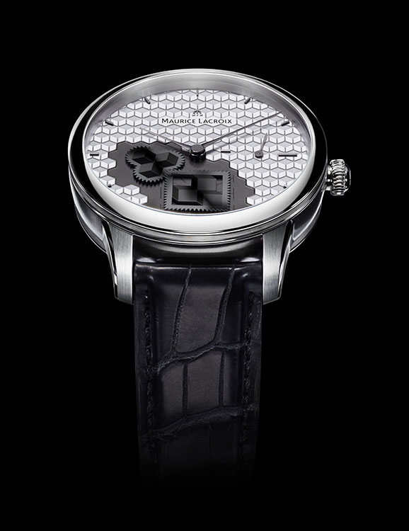 Третья новинка сезона от Maurice Lacroix, продолжившая фантазии на тему «шедевр квадратного колеса» и открывающая простор воображению, получила лаконичное и одновременно ёмкое название «Куб». Всей лицевой стороне корпуса часов свойственна обворожительная глубина. Однако квинтэссенцией мужских часов «Maurice Lacroix Masterpiece Square Wheel Cube» является оригинальный дизайн циферблата, на котором, как и у предшествующих моделей, отражены четыре функции, реализуемые центральными стрелками, указателем запаса хода и квадратным колесом. Поверхность циферблата украшает выгравированный лазером ячеистый рисунок с родиевым покрытием. Совокупность серых и белых ромбовидных ячеек даёт удивительный визуальный эффект. Их сочетание, под разным углом зрения и разной степени освещённости, воспроизводит то множество объёмно-кубических фигур, то сотовую конструкцию, то мерцающее волнообразное пространство. При этом условные индексы в виде тонких рисок абсолютно не теряются из виду. Следующим необычным элементом циферблата являются традиционные выемки для колёс оригинальной формы. Да, выемки традиционные, но их форма отнюдь не круглая. Она очерчивается границей ячеистого рисунка. И, наконец, сами эти колёса, а точнее их голографическое оформление в виде кубиков, которые благодаря игре света воспринимаются в формате 3D. Тем не менее, несмотря на то, что креативный по своему дизайну циферблат возбуждает воображение, индикация времени на циферблате сохраняет удобство и чёткость. Masterpiece Square Wheel «Cube» – очередное свидетельство неудержимости прогресса в часовом деле и великолепный образец современного швейцарского инженерного мастерства, уверенно завоёвывающего будущее на основе передовых технологий, инновационных подходов и верности золотому фонду часовых традиций. Часы «Maurice Lacroix Masterpiece Square Wheel Cube» выпущены ограниченной серией в количестве 88 экземпляров.
