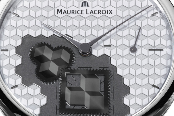 Циферблат модели «Maurice Lacroix Masterpiece Square Wheel Cube» самый необычный. Его поверхность представляет собой выгравированный лазером ячеистый рисунок с родиевым покрытием. Выемки, чёрного цвета с пескоструйной обработкой, имею оригинальную форму. Восемь условных часовых индексов и два деления на шкале указателя запаса хода отделаны чернёным золотом. Кремниевое квадратное колесо, выполняющее функцию индикатора секунд, и трилистник украшает голографический рисунок в форме кубиков. Указатель секунд покрыт белым люминесцентным составом «голубое свечение». Тонкие центральные стрелки часов и минут, а также стрелка индикатора запаса хода декорированы чернёным золотом.