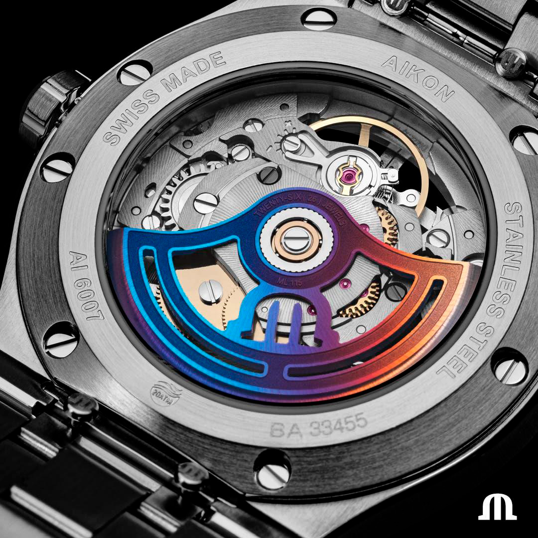 Радужная тема также распространяется на осциллирующий груз, который устраняет необходимость в ручном подзаводе. Его можно увидеть во всей красе благодаря сапфировой задней крышке. Часы заключены в корпус из нержавеющей стали скромного размера диаметром 39 мм, представлены на браслете в тон и поставляются с дополнительным черным каучуковым ремешком. Оригинальная система легкой замены ремешка от Maison обеспечивает простое переключение между браслетом и ремешком без использования инструментов.