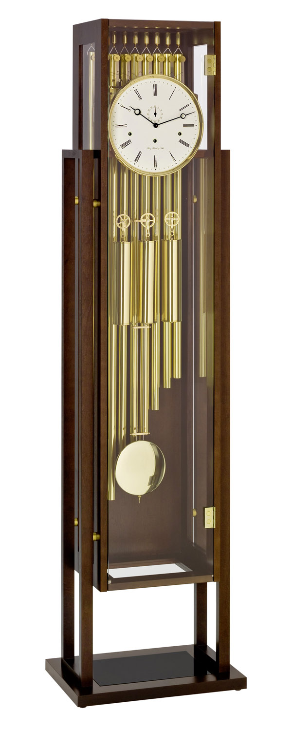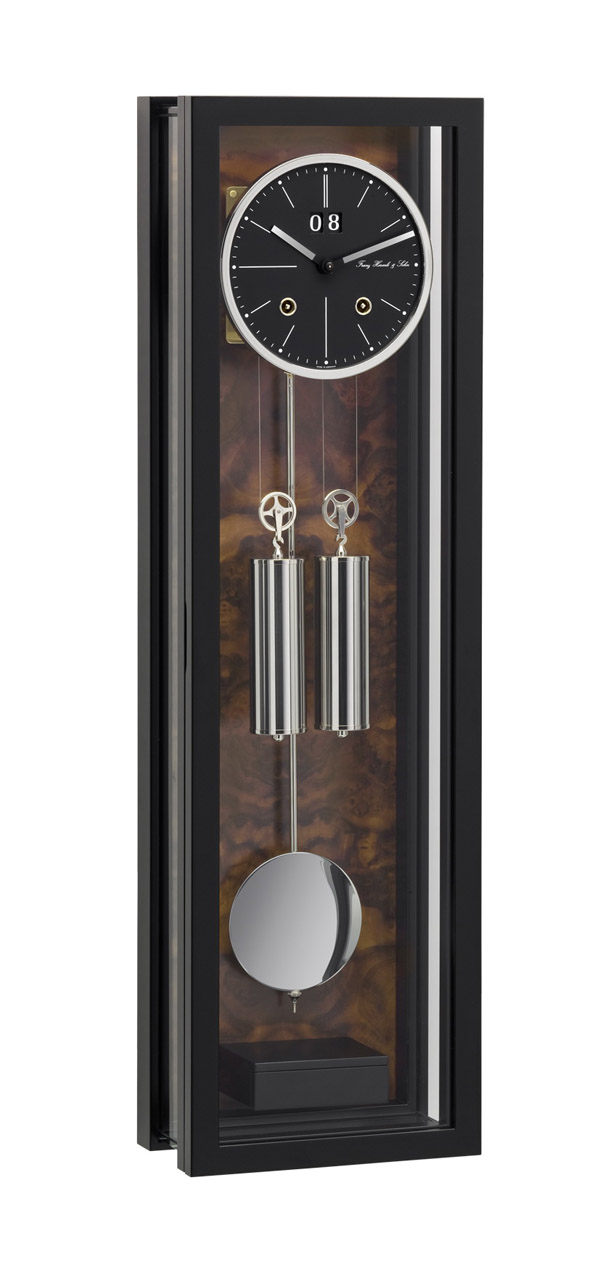 Элегантный тросовый механизм расположен в корпусе из черного лакированного дерева и покрыт кольцеобразным стеклом; в отделке задней стенки используется кап орехового дерева. Часы имеют черный металлический циферблат, хромированные ободок, маятник и встроенный ящик для заводного ключа.
