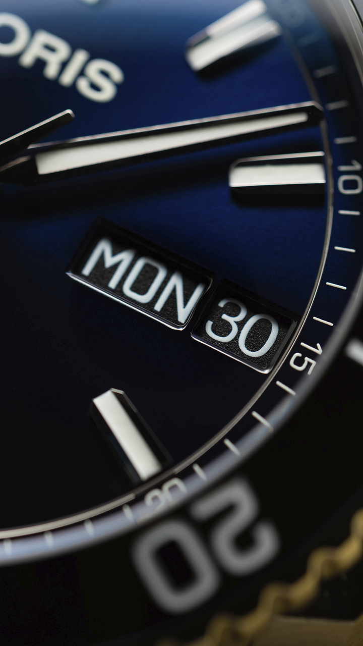 - Автоматический калибр Oris 752 (базовый механизм SW220-1) с окошком указателя даты и дня недели увеличенного размера в положении «3 часа».