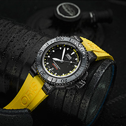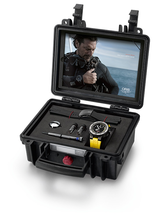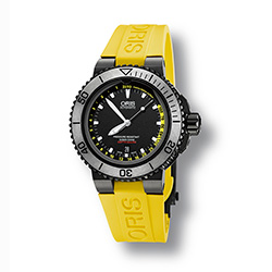 Новинка выпущена с чернёным корпусом и жёлтым каучуковым ремешком и также как и часы «Oris Aquis Depth Gauge» образца 2013 года оснащена простым, оригинальным и надёжным индикатором глубины, созданным и запатентованным компанией «Oris» специально для механических часов.