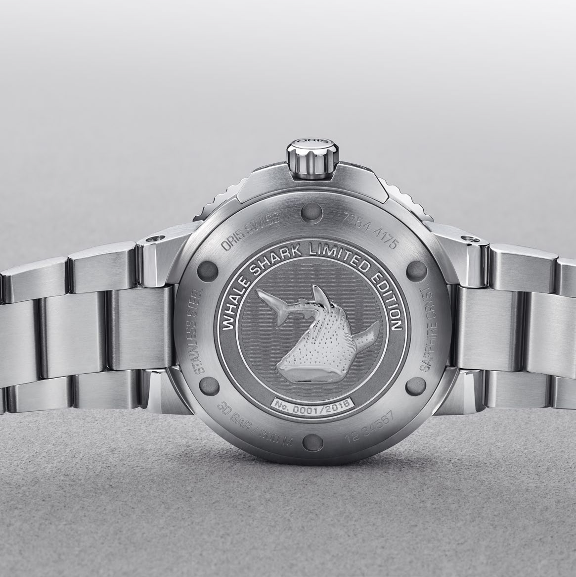 Дизайн часов Oris Whale Shark Limited Edition основывается на дайверских моделях Oris Aquis GMT. Выпуск часов лимитирован 2016 экземплярами – так отмечается год знаменательного объявления Международного союза охраны природы и природных ресурсов о ситуации с китовыми акулами.