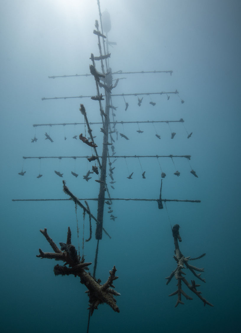 Процедура восстановления рифа напоминает процесс использования черенков для выращивания новых растений. Мы повторяем природные процессы, забирая отростки со здоровых кораллов, которым удалось пережить жару 2016 и 2017 года. Кораллы собираются и врезаются в материнские колонии и отрезки кораллов длиной около 5–15 см. Эти материнские колонии крепятся к конструкциям коралловых деревьев в питомниках, расположенных в океане рядом с поврежденным рифом. После роста в течение 6–12 месяцев фрагменты внедряются обратно в риф для восстановления поврежденных участков. Из одного маленького саженца мы можем создать тысячи новых прочных кораллов. Эти кораллы вырастут, и процесс станет непрерывным циклом, позволяющим создавать тысячи новых кораллов из одной срезанной ветки.