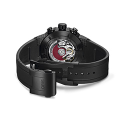 К часам «Oris Williams Chronograph Carbon Fibre Extreme» прилагается чёрный каучуковый ремешок с раскладывающейся титановой застёжкой, имеющей DLC-покрытие чёрного цвета.